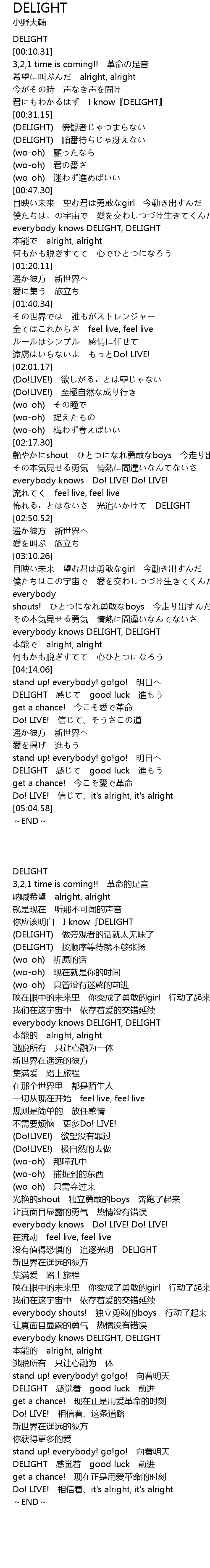 | [04:23.20] | DELIGHT 感じて good luck 進もう |