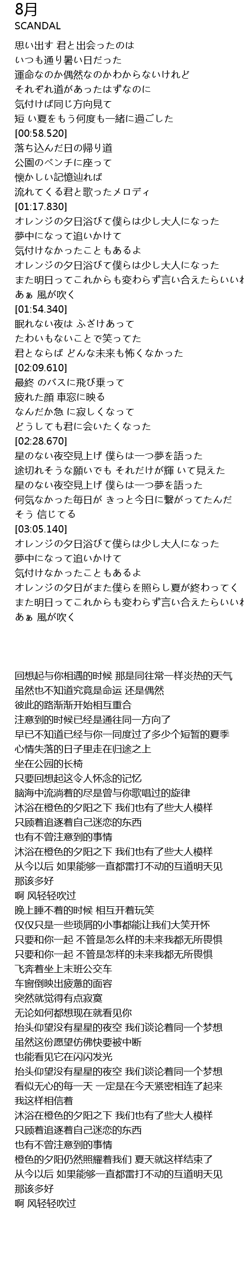 | [03:32.490] | オレンジの夕日がまた僕らを照らし夏が終わってく |