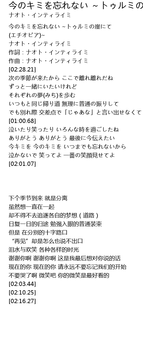 | [02:03.44] | 今のキミを忘れない ~トゥルミの崖にて (エチオピア)~ |