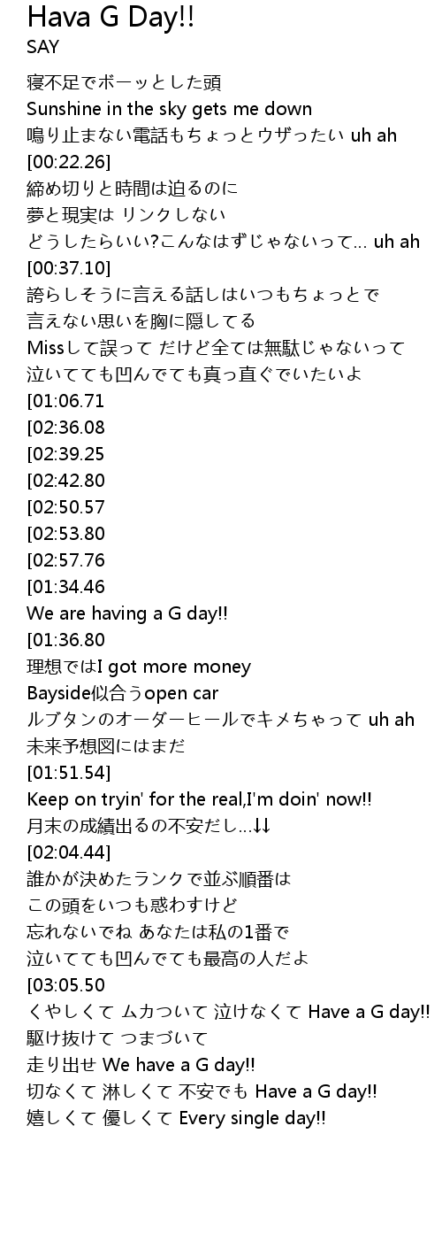 | [03:02.98][01:34.46] | Let' s have a G day!! |
