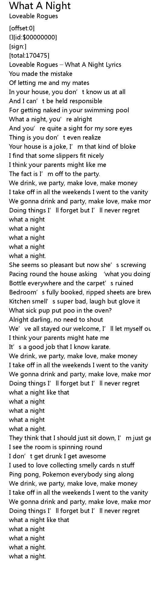 | [00:01.235] | Loveable Rogues What A Night Lyrics |
