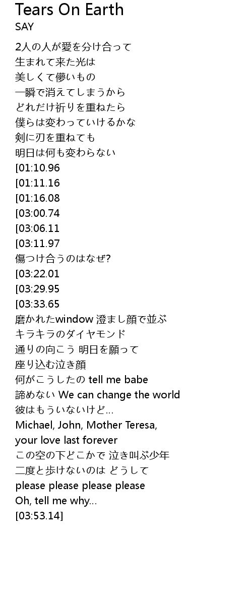 | [04:12.48][03:11.97][01:32.48] | 同じ空に抱かれながら 傷つけ合うのはなぜ? |