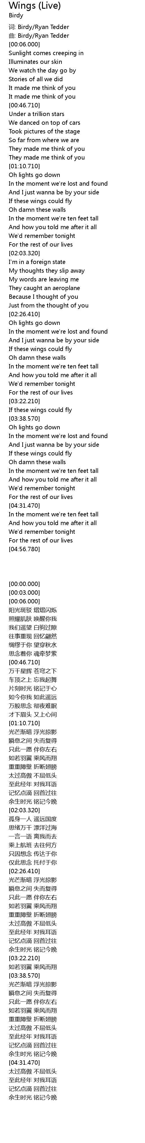 | [00:00.000] | 词: Birdy/Ryan Tedder |