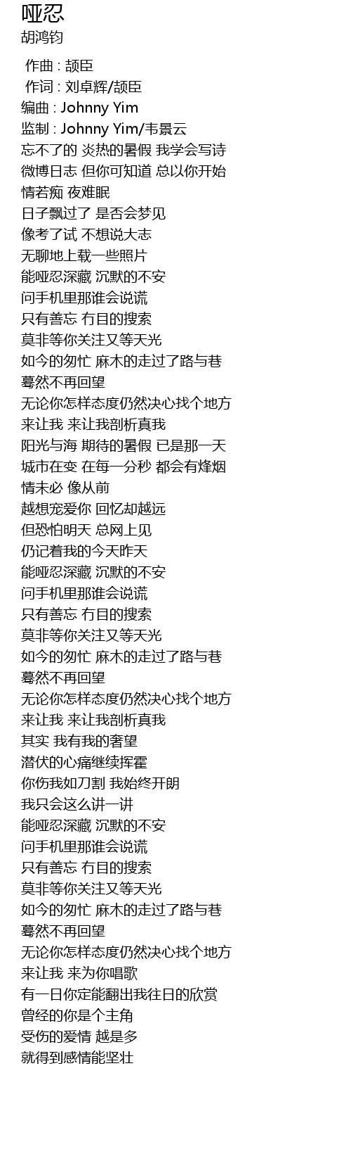 | [00:06.00] | 编曲 : Johnny Yim |