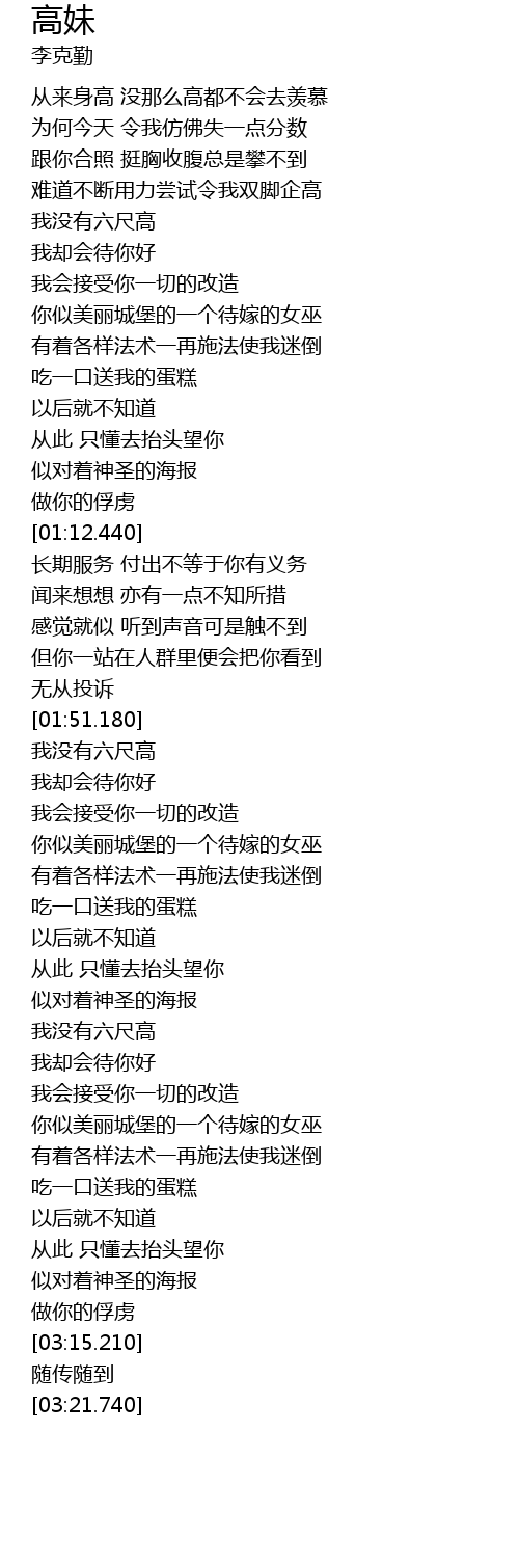 | [00:13.540] | 从来身高 没那么高都不会去羡慕 |