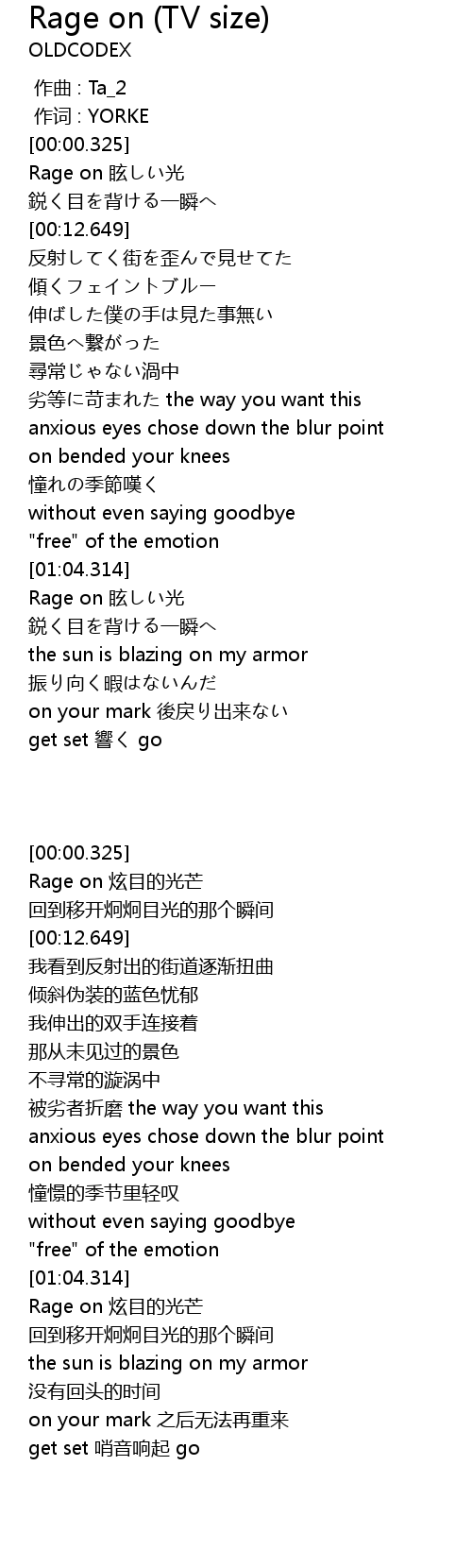| [01:05.177] | Rage on 眩しい光 |