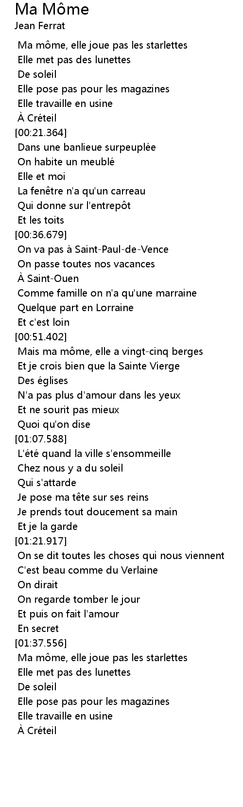 | [00:52.675] | Mais ma môme, elle a vingt-cinq berges |