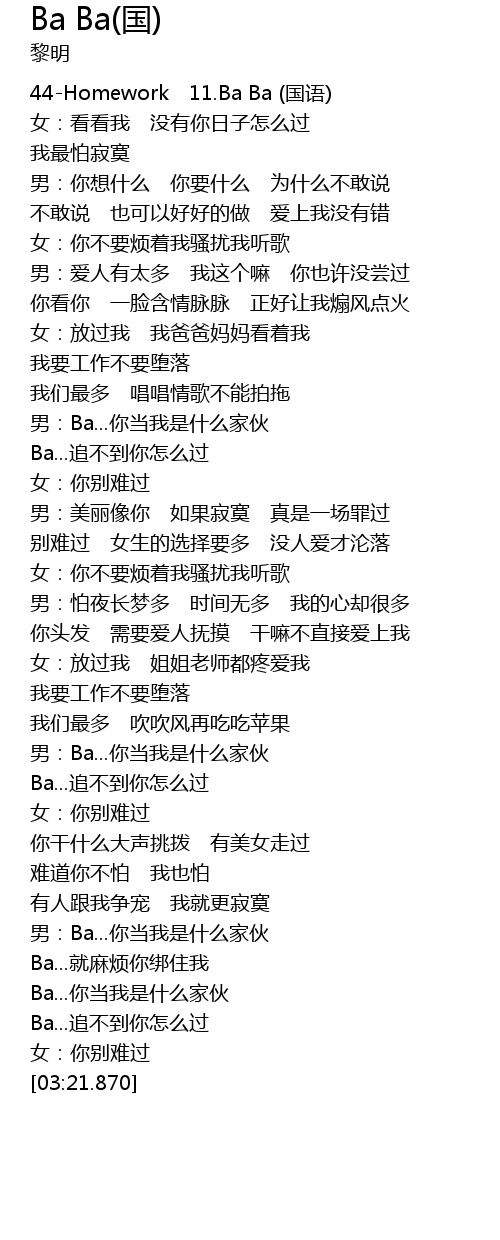 | [00:00.000] | 44-Homework 11.Ba Ba (国语) |