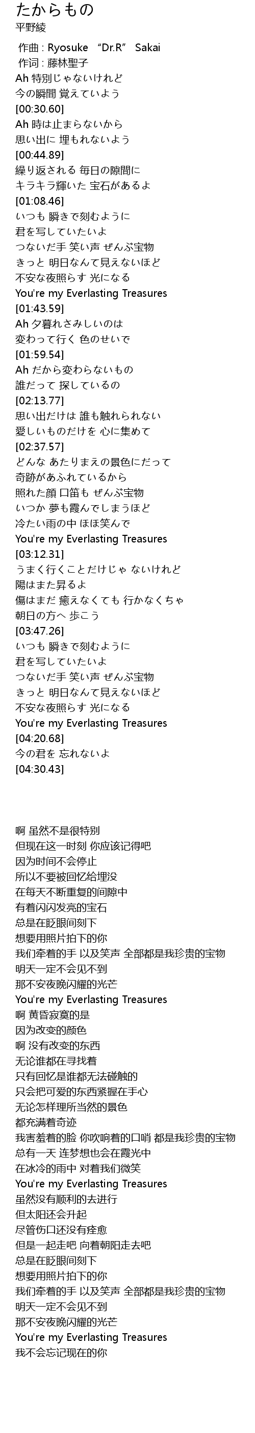 | [03:56.77] | つないだ手 笑い声 ぜんぶ宝物 |