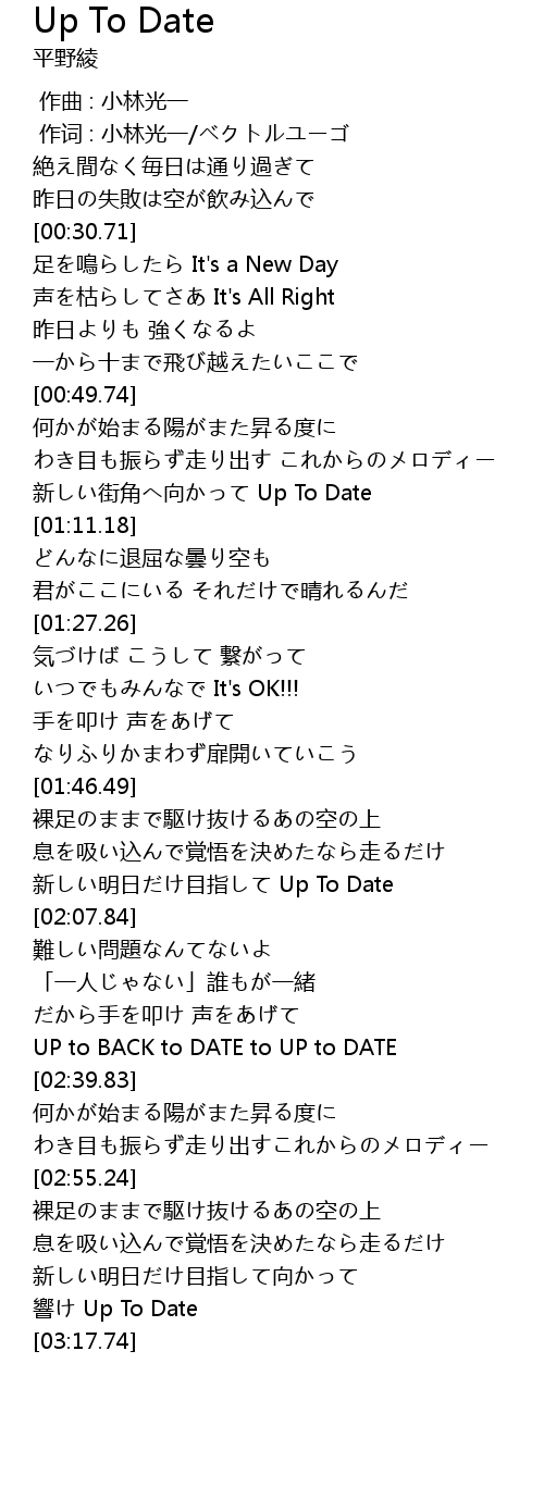 | [02:02.33] | 新しい明日だけ目指して Up To Date |