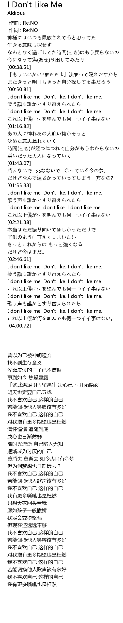 | [03:34.56] | I don't like me. Don't like. I don't like me. |