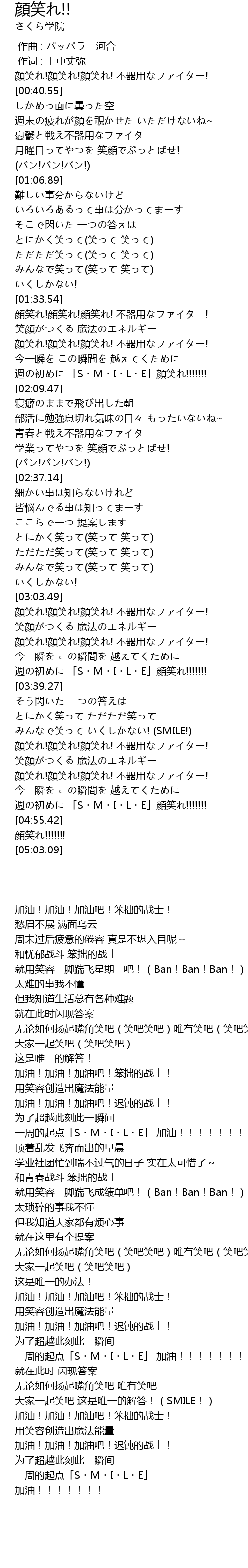 | [02:50.67] | とにかく笑って(笑って 笑って) ただただ笑って(笑って 笑って) |