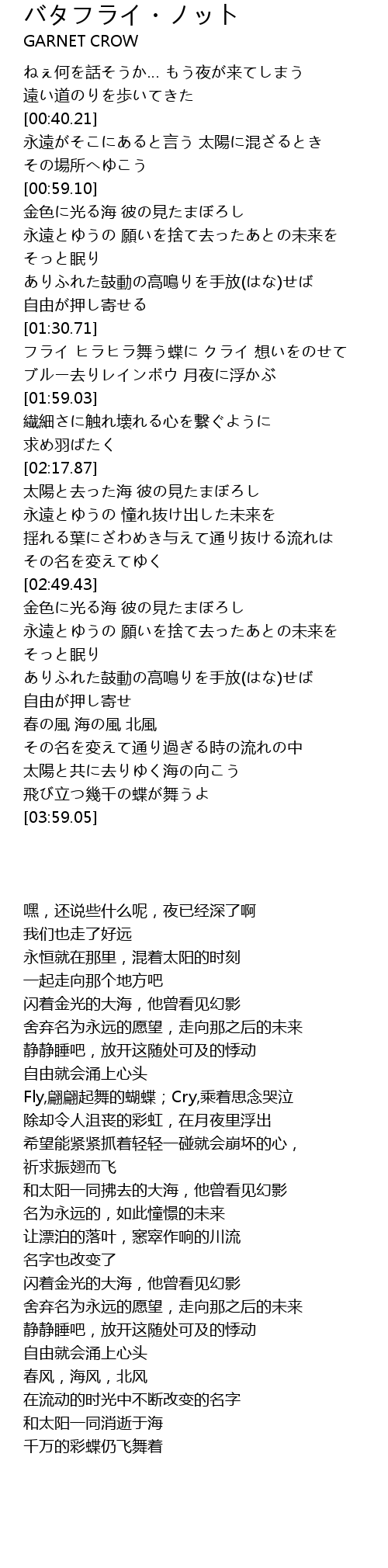 | [01:33.52] | フライ ヒラヒラ舞う蝶に クライ 想いをのせて |