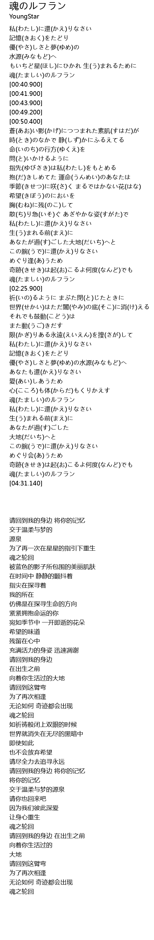 | [03:57.100] | 私(わたし)に還(かえ)りなさい 生(う)まれる前(まえ)に |