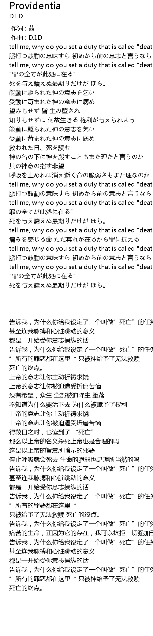 | [01:57.00] | tell me, why do you set a duty that is called " death" to me? |