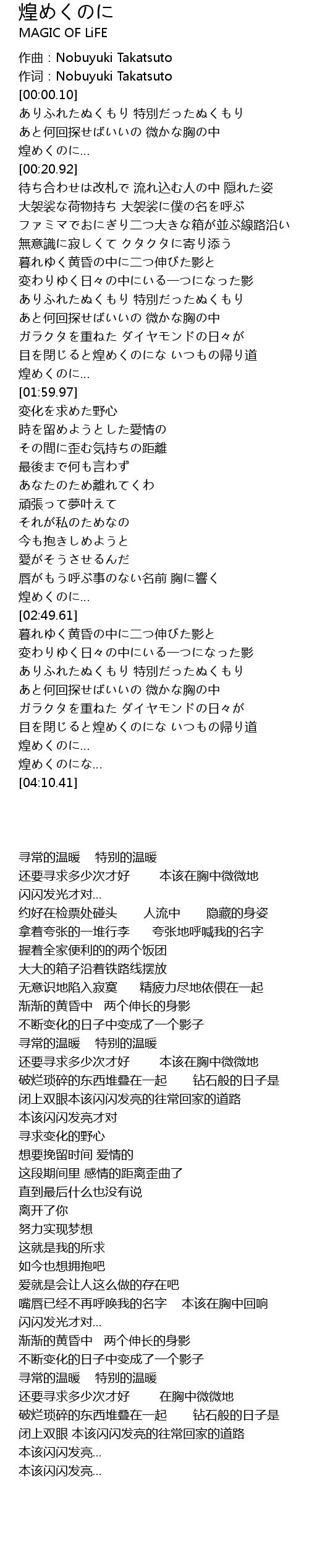 | [03:43.78] | 目を閉じると煌めくのにな いつもの帰り道 |