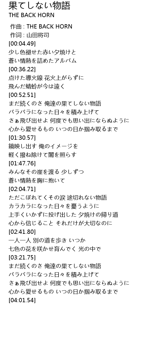 | [00:53.18] | まだ続くのさ 俺達の果てしない物語 |
