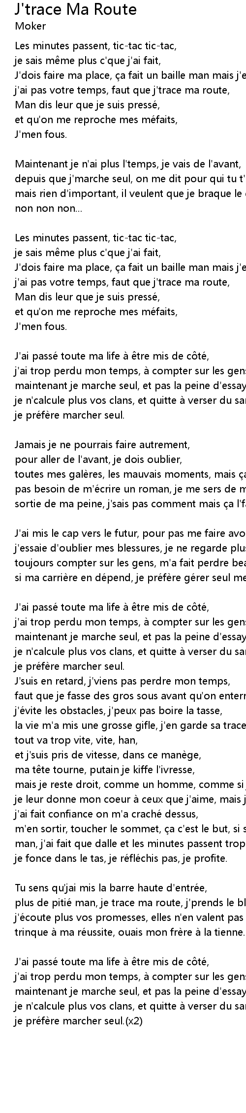 | j' ai pas votre temps, faut que j' trace ma route, | |