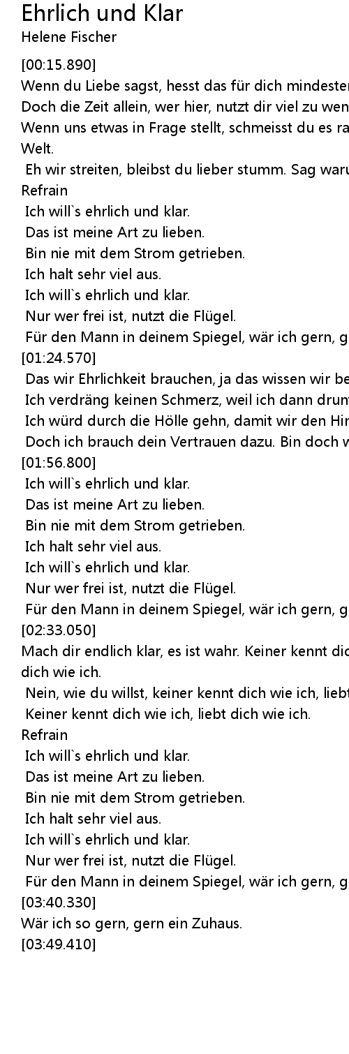 | [01:03.390] | Ich will`s ehrlich und klar. |