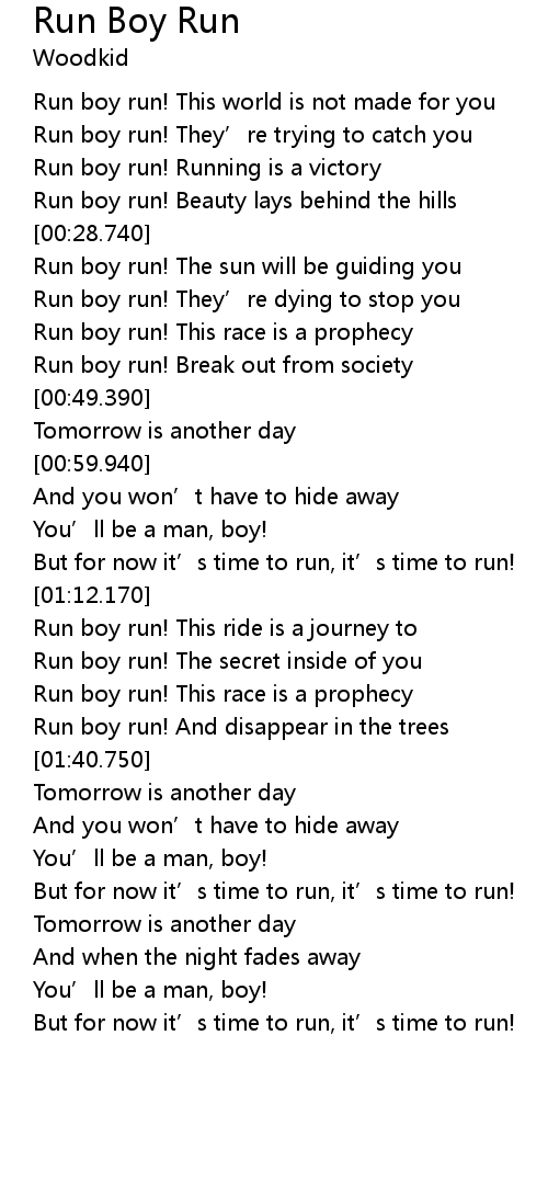 | [00:17.800] | Run boy run! They' re trying to catch you |
