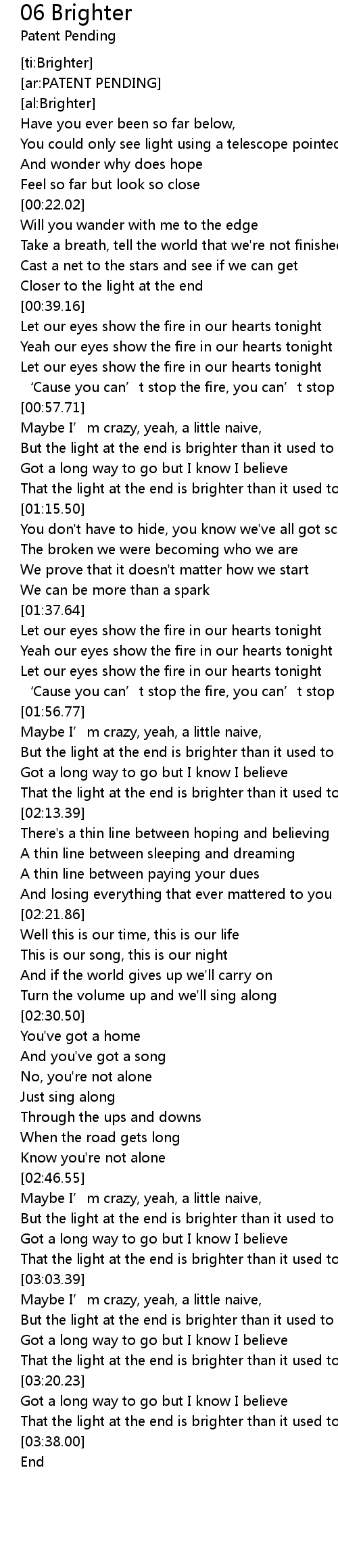 | [02:58.73] | That the light at the end is brighter than it used to be |