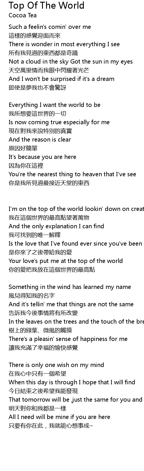 | Your love's put me at the top of the world | |