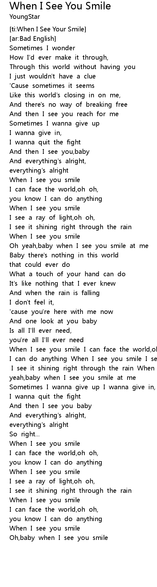 When I see you smile I can face the world,oh oh you know I can do anything When I see you smile I see a ray of light,oh oh I see it shining right through the rain When I see you smile Oh yeah,baby when I see you smile at me |