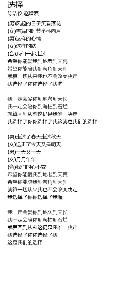 | wǒ xuǎn zé le nǐ nǐ xuǎn zé le wǒ zhè jiù shì wǒ men de xuǎn zé | |