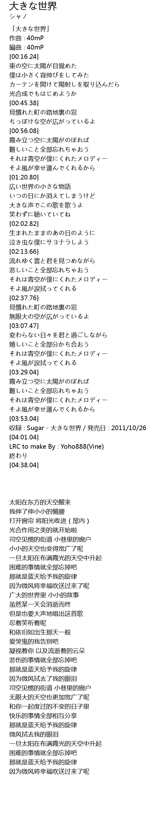 | [03:56.04] | 収録∶Sugar - 大きな世界/発売日∶2011/10/26 |
