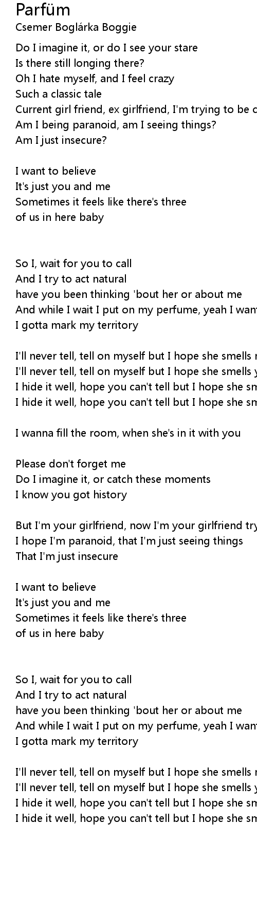 I'll never tell, tell on myself but I hope she smells your perfume |