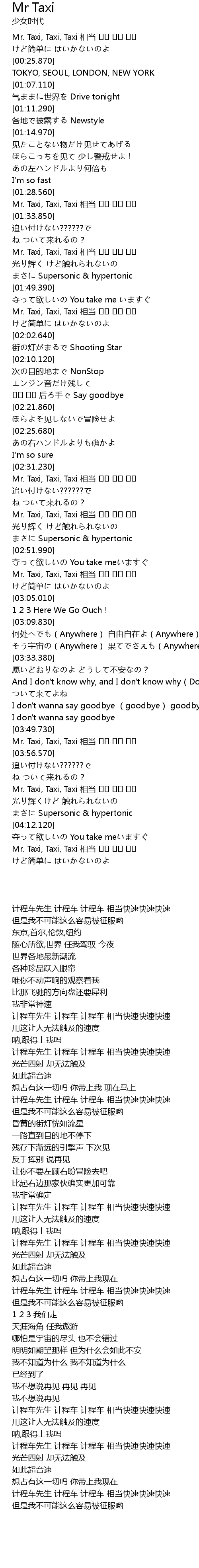| [01:38.780] | Mr. Taxi, Taxi, Taxi 相当 즉시 즉시 즉시 |