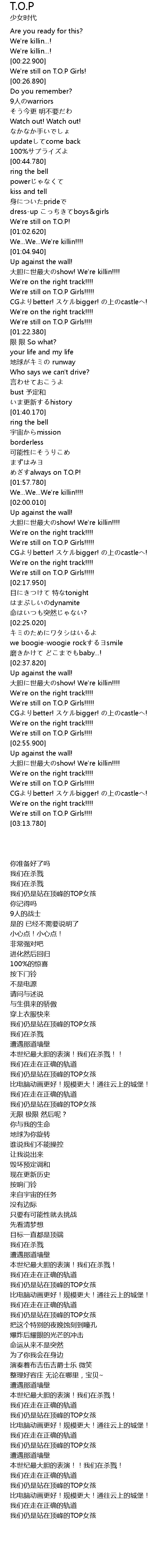 | [03:11.540] | We' re still on T. O. P Girls!!!! |