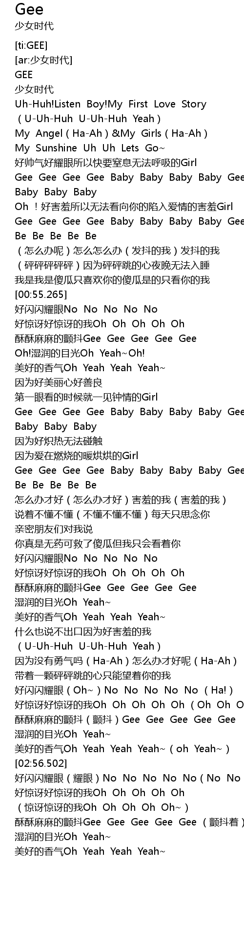 | [01:25.562] | Gee Gee Gee Gee Baby Baby Baby Baby Gee Gee Gee Gee Baby Baby Baby Baby |