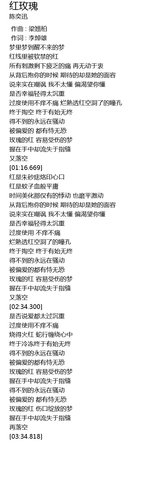 | [02:22.818] | 玫瑰的红 容易受伤的梦 |