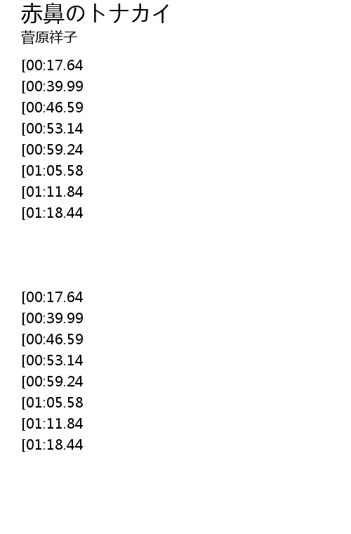 | [02:41.57][01:11.84] | いつも泣いてたトナカイさんは |