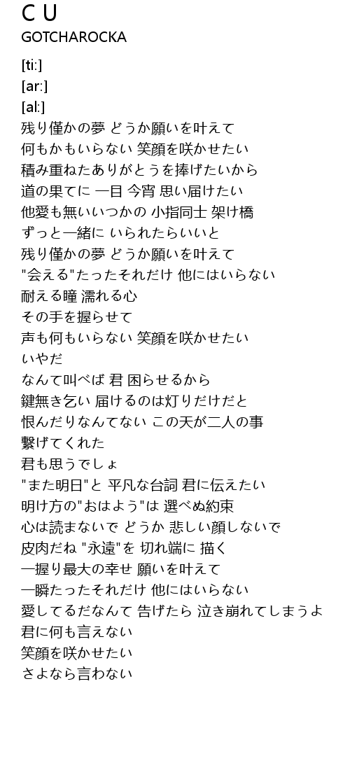 | [00:00.00] | 残り僅かの夢 どうか願いを叶えて |