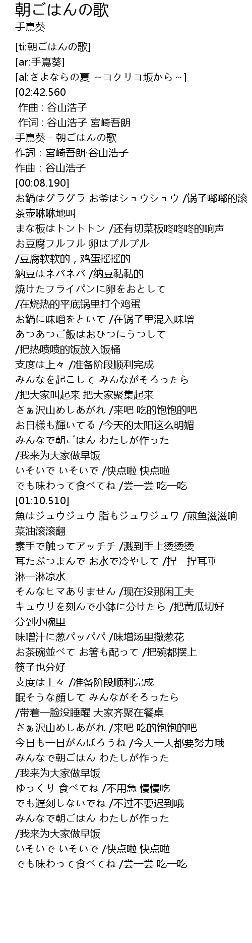 | [00:00.000] | 手嶌葵 - 朝ごはんの歌 |