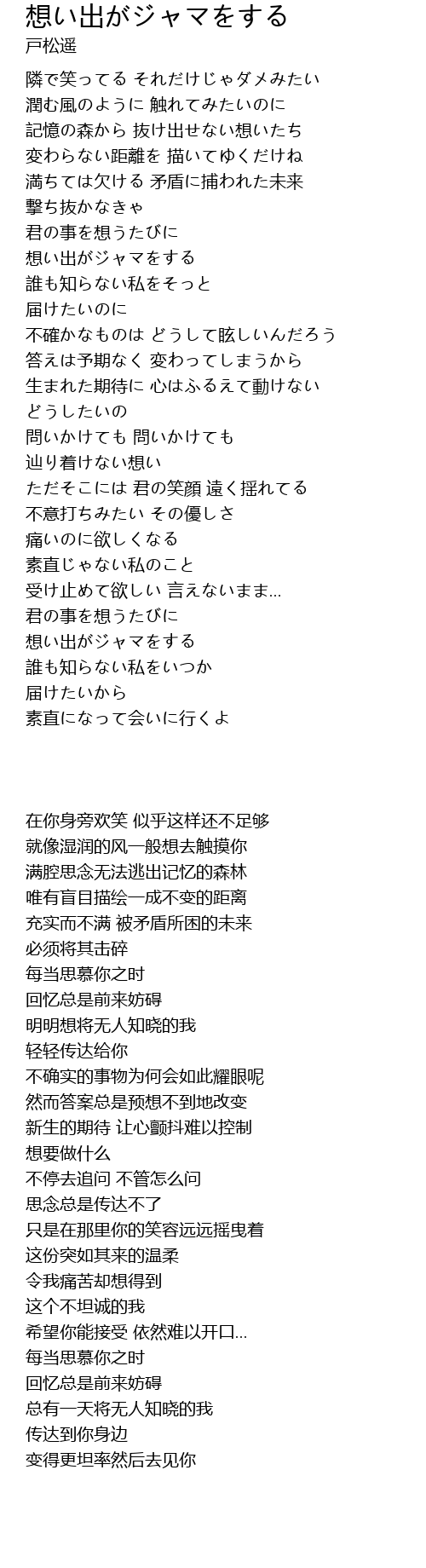 | [00:33.080] | 変わらない距離を 描いてゆくだけね |