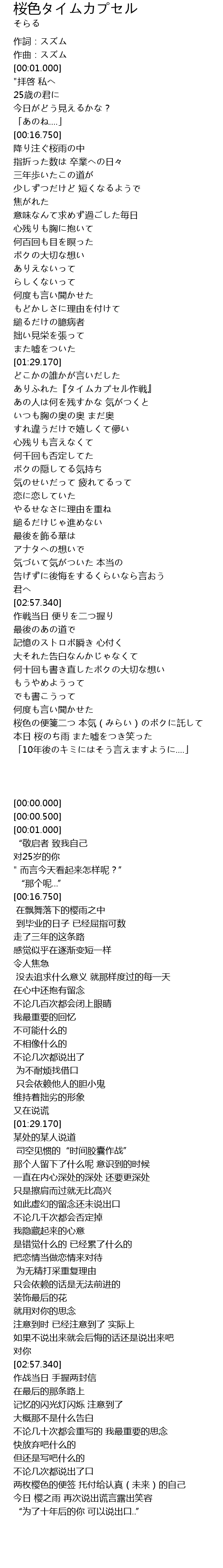| [03:47.730] | 桜色の便箋二つ 本気(みらい)のボクに託して |