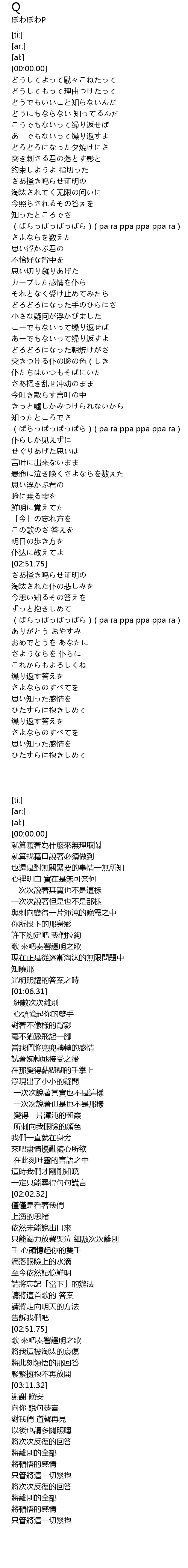 | [03:11.32] | (ぱらっぱっぱっぱら)( pa ra ppa ppa ppa ra ) |