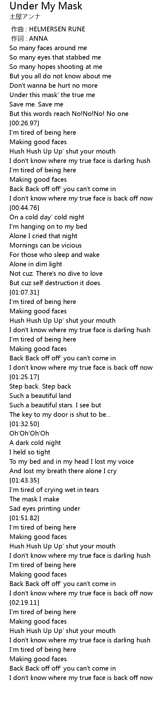 | [00:31.69] | I don' t know where my true face is darling hush |