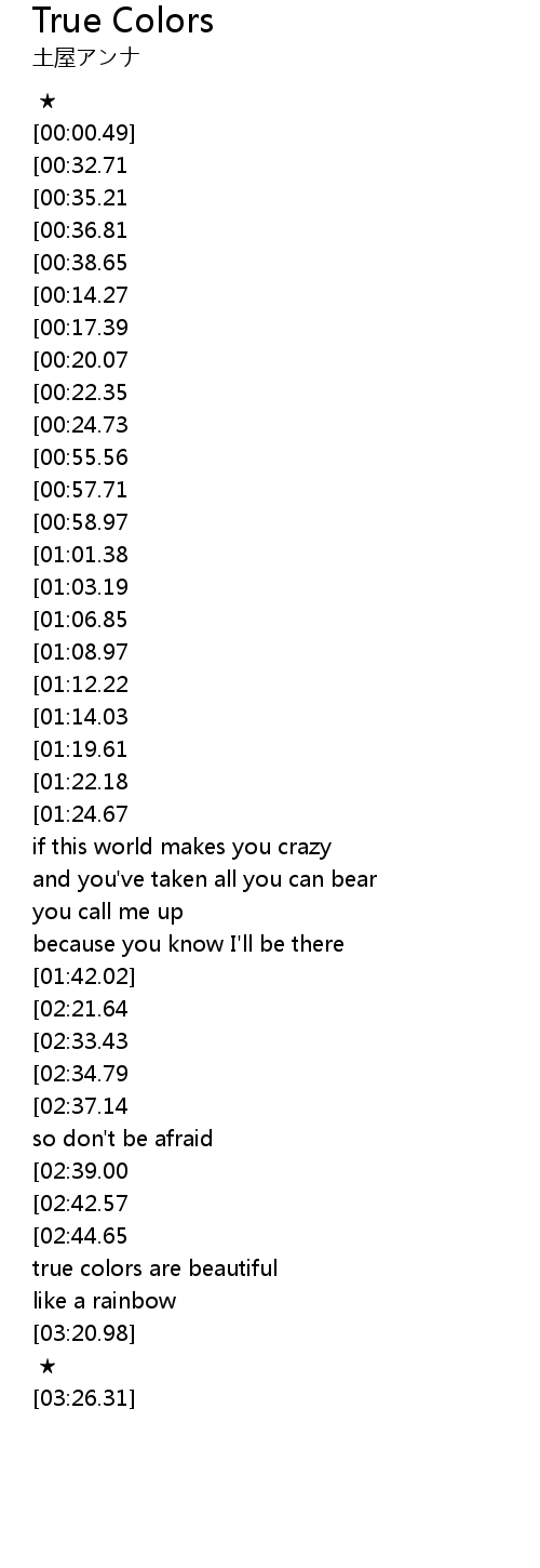 | [03:09.17][02:44.65] | true colors, oh true colors |