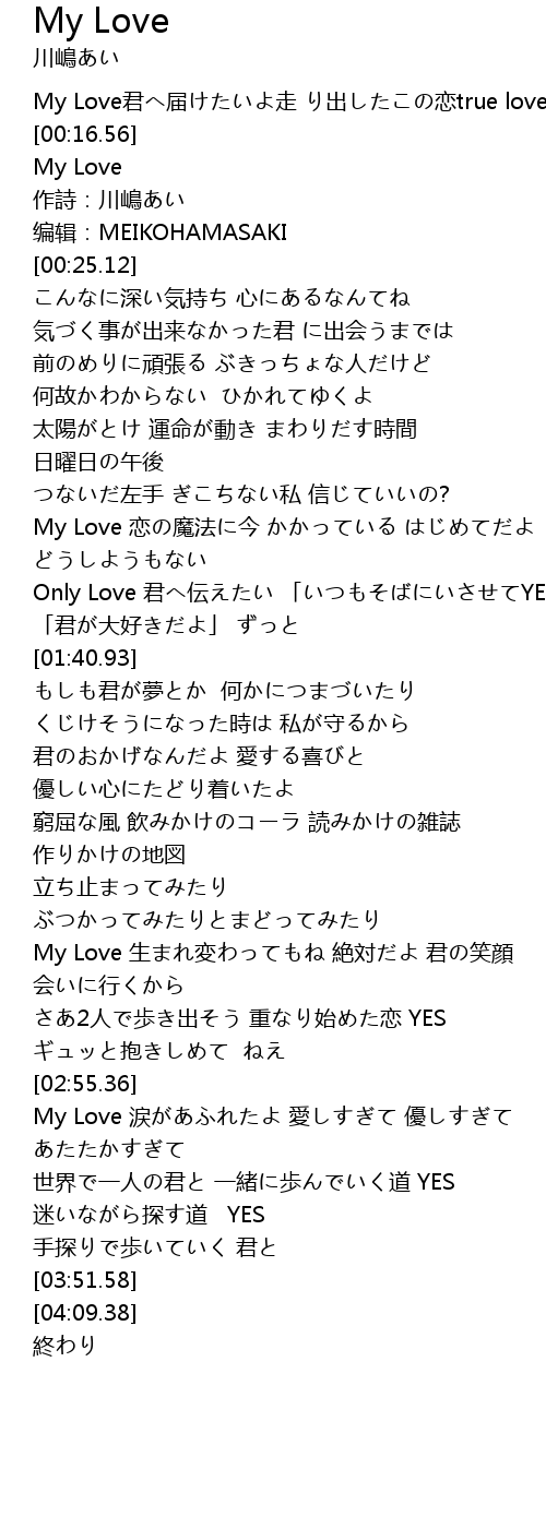 | [02:23.48] | My Love 生まれ変わってもね 絶対だよ 君の笑顔 |