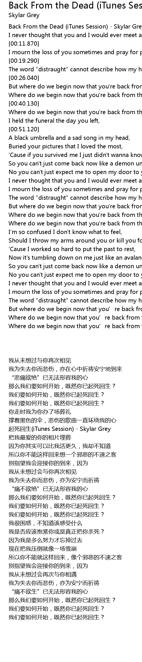 | [00:40.950] | Where do we begin now that you' re back from the dead? |