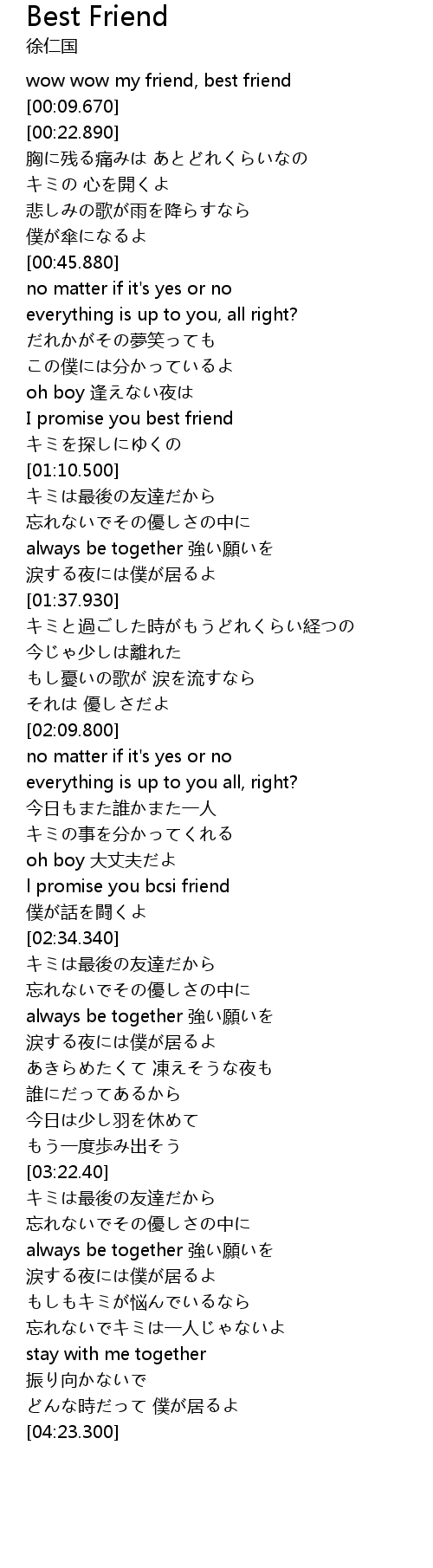| [04:02.730] | 忘れないでキミは一人じゃないよ |