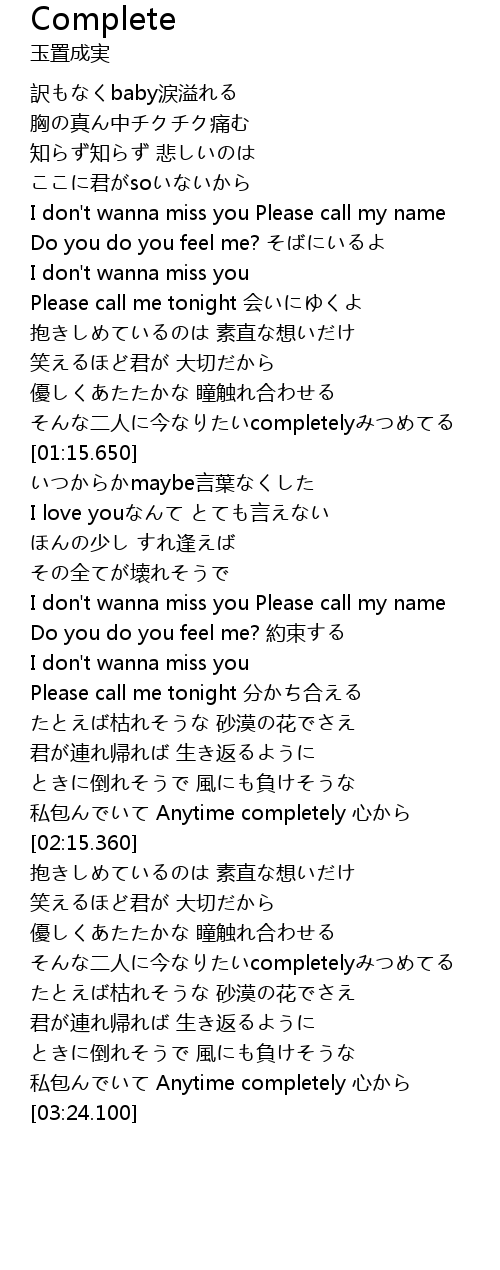 | [00:40.830] | I don't wanna miss you Please call my name |