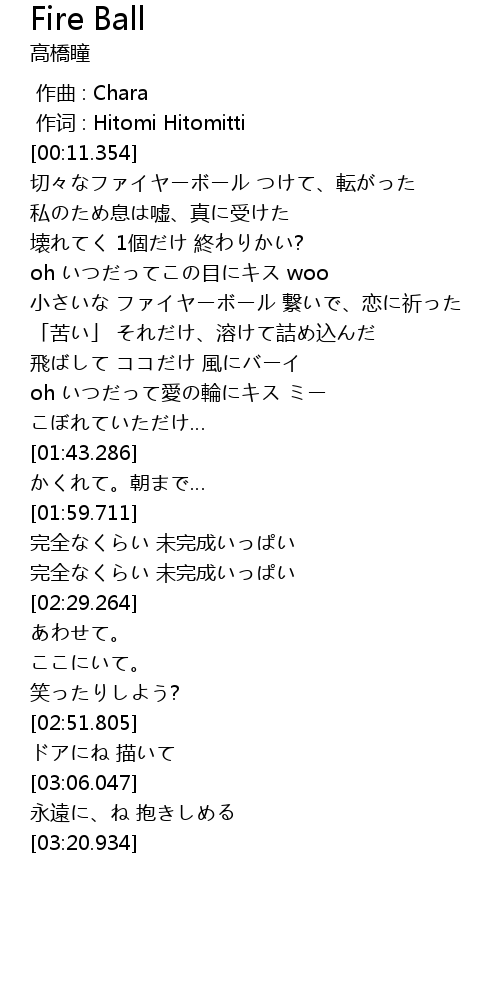| [00:59.526] | 小さいな ファイヤーボール 繋いで、恋に祈った |