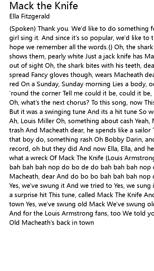 {Spoken} Thank you. We'd like to do something for you now. We haven't heard a girl sing it. And since it's so popular, we'd like to try and do it for you. We hope we remember all the words.{} Oh, the shark has pearly teeth, dear And he shows them, pearly white Just a jack knife has Macheath, dear And he keeps it out of sight Oh, the shark bites with his teeth, dear Scarlet billows start to spread Fancy gloves though, wears Macheath dear So there's not, not a trace of red On a Sunday, Sunday morning Lies a body, oozin' life Someone's sneaking 'round the corner Tell me could it be, could it be, could it be Mack the Knife? Oh, what's the next chorus? To this song, now This is the one, now I don't know But it was a swinging tune And its a hit tune So we tried to do Mack The Knife Ah, Louis Miller Oh, something about cash Yeah, Miller, he was spending that trash And Macheath dear, he spends like a sailor Tell me, tell me, tell me Could that boy do, something rash Oh Bobby Darin, and Louis Armstrong They made a record, oh but they did And now Ella, Ella, and her fellas We're making a wreck, what a wreck Of Mack The Knife {Louis Armstrong imitation} Oh Snookie Taudry, bah bah bah nop do bo de do bah bah bah nop do bo de do Just a jack knife has Macheath, dear And do bo bo bah bah bah nop do bo de do {} So, you've heard it Yes, we've swung it And we tried to Yes, we sung it You won't recognize it It's a surprise hit This tune, called Mack The Knife And so we leave you, in Berlin town Yes, we've swung old Mack We've swung old Mack in town For the Darin fans, And for the Louis Armstrong fans, too We told you look out, look out, look out Old Macheath's back in town |
