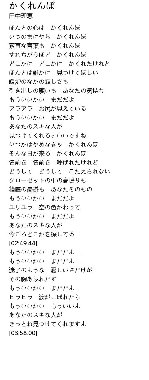 | [01:38.91] | いつかはやめなきゃ かくれんぼ |
