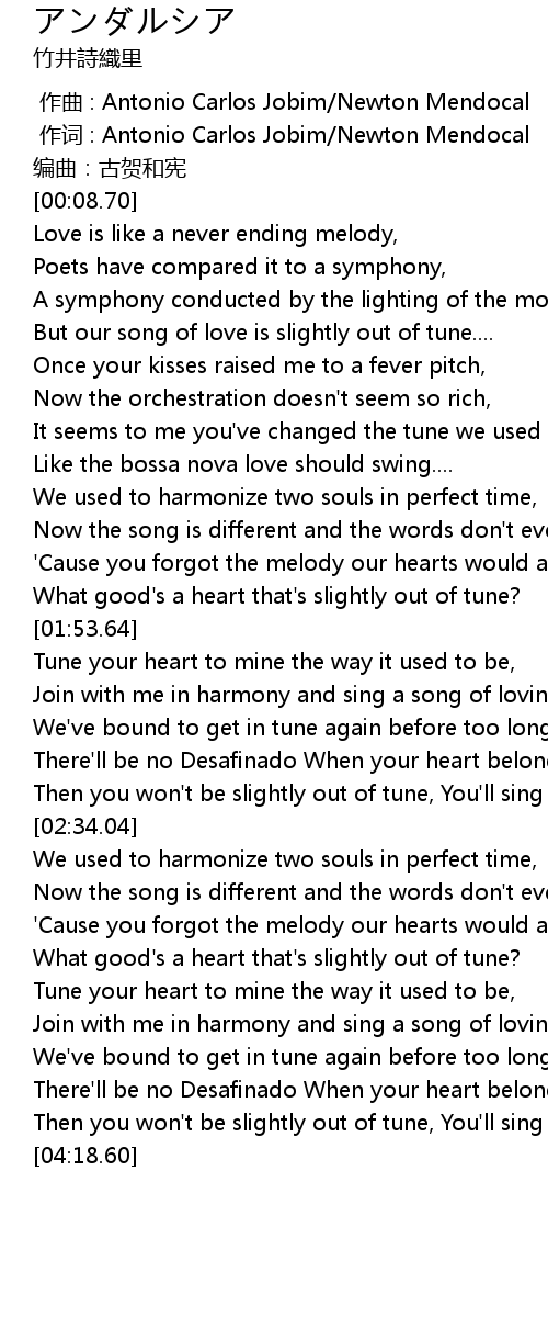 | [02:18.59] | There' ll be no Desafinado When your heart belongs to me completely |
